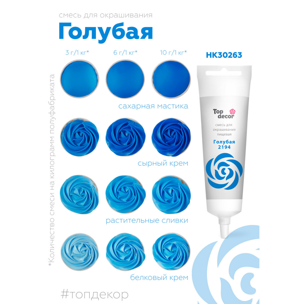 Краситель водорастворимый с высокой концентрацией красящего пигмента. Густая консистенция позволяет ему хорошо окрашивать по всей массе основные кондитерские полуфабрикаты (желе, мусс, крем, тесто, мастика и другие), не изменяя их консистенцию. Не имеет вкуса и аромата, благодаря чему сохраняет первоначальные вкусовые свойства окрашиваемого продукта. Рекомендуемая дозировка: 2-3 капли (0,1-0,15 г) на 100 грамм окрашиваемой массы. Продаётся в тюбике по 100 грамм. Способ применения: перед применением проколите пломбу тюбика, срезать не рекомендуется.