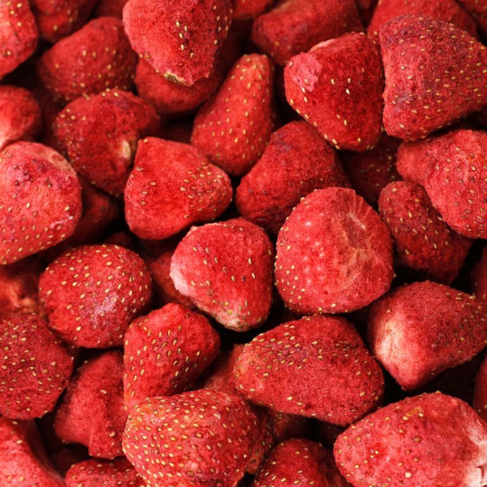 Сублимированные кусочки благодаря технологическим особенностям обработки сохраняет в себе все качества свежего плода. Сублимация выводит влагу из ягод клубники, оставляя в них до 96% полезных витаминов и микроэлементов. Сублимированные кусочки клубники используется в качестве добавки и декора в кондитерских изделиях. Представляют собой нарезанные кубиком ягод клубники 3-5 мм.