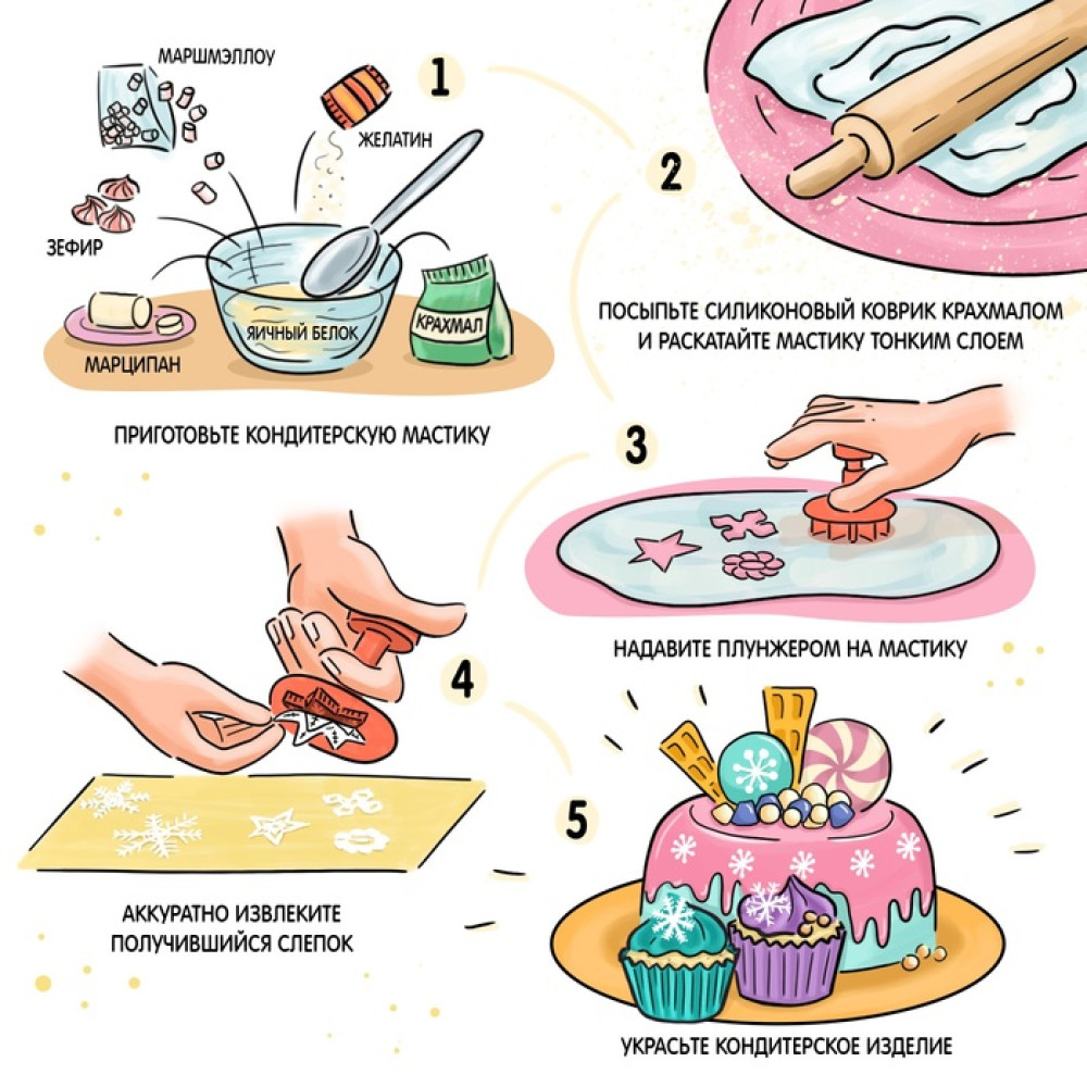 Используйте плунжеры по мере необходимости для создания декоративных элементов из мастики или марципана. Для предотвращения прилипания материала, рекомендуется смазывать рабочую поверхность плунжеров растительным жиром или присыпать крахмалом.