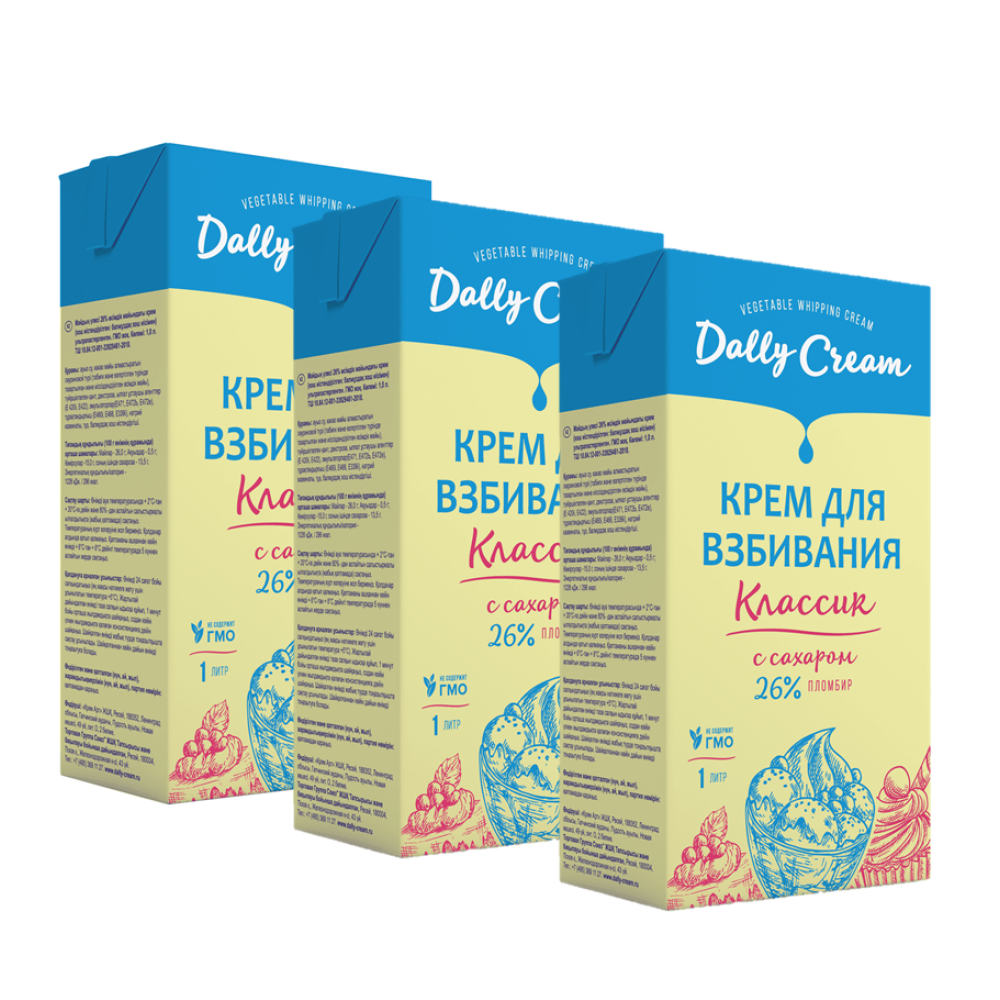 Dally Cream Классик 26% "Ваниль" - это классический кондитерский крем с традиционным сливочным вкусом и тонким ароматом ванили. Растительные сливки для взбивания не содержат лактозы, холестерина, ГМО и консервантов. Подходят для декорирования, прослойки и наполнения кондитерских изделий.